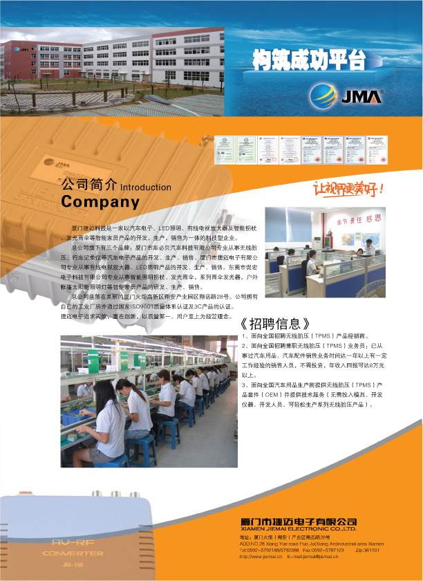 厦门捷迈科技是一家以汽车电子、LED照明、有线电视放大器及智能拐杖、发光雨伞等智能家居产品的开发,生产,销售为一体的科技型企业。
