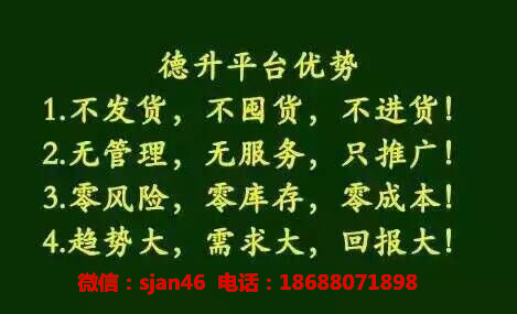 八大优势:1,不进货,不发货。2,不用自己快递填单。3,不雇人,不发工资。4,不囤货,不库存,不管售后服务。5,每月不付租金。6,一部手机,二十四小时为您工作。7,只赚不赔零风险!8,只推广,坐享(销售额)30%纯利润。9,代理整个商城上百个知名品牌。10,CCTV中央电视台对德升做了专题报道。